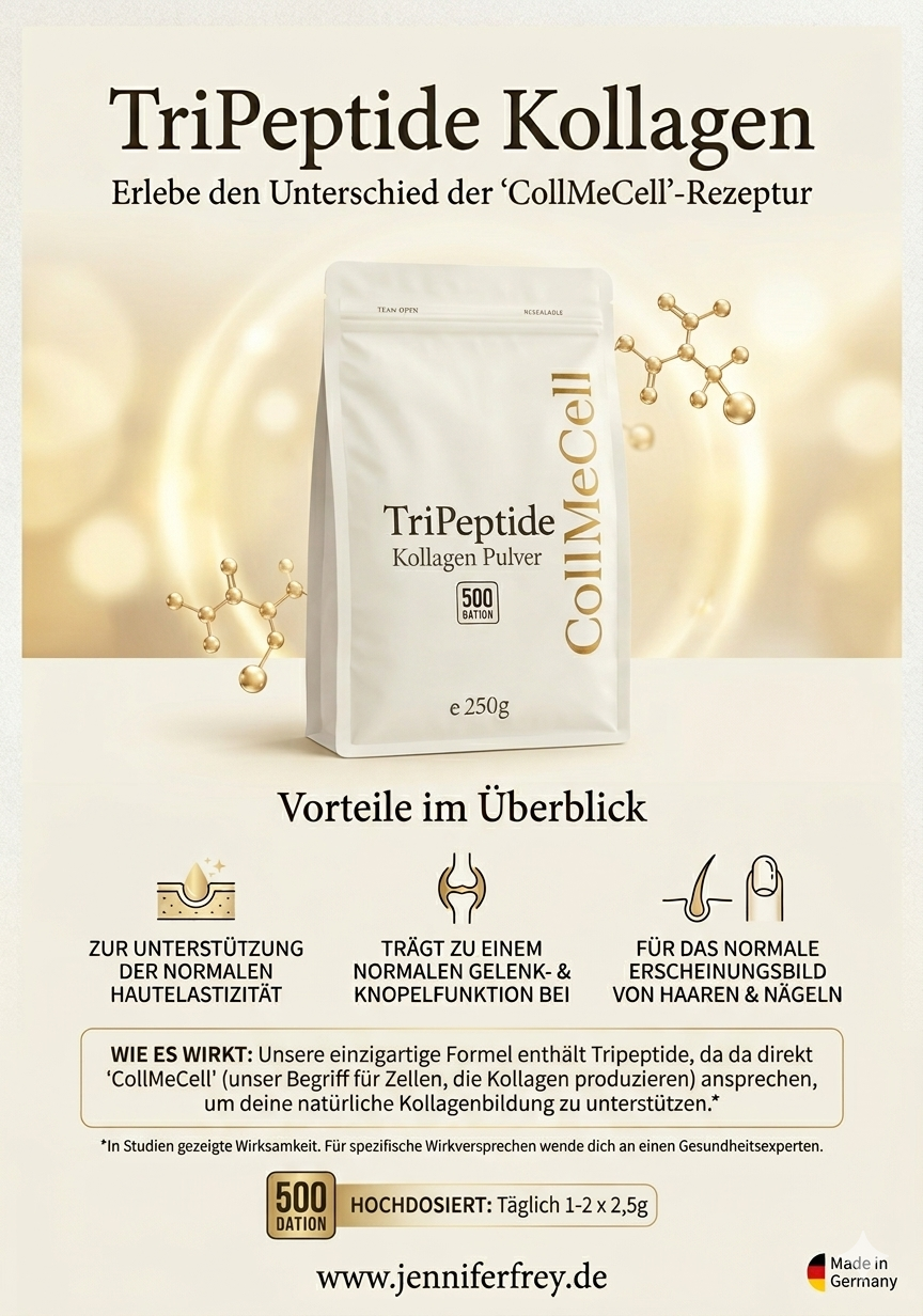 CollMeCell TRIPEPTIDE Kollagen Pulver ist auf ein Molekulargewicht von ~500 Dalton hydrolysiert – noch feiner als klassische Kollagen-Peptide. Das Ergebnis: ein Pulver, das sich blitzschnell in jedem Getränk auflöst, ohne zu klumpen oder zu schäumen.